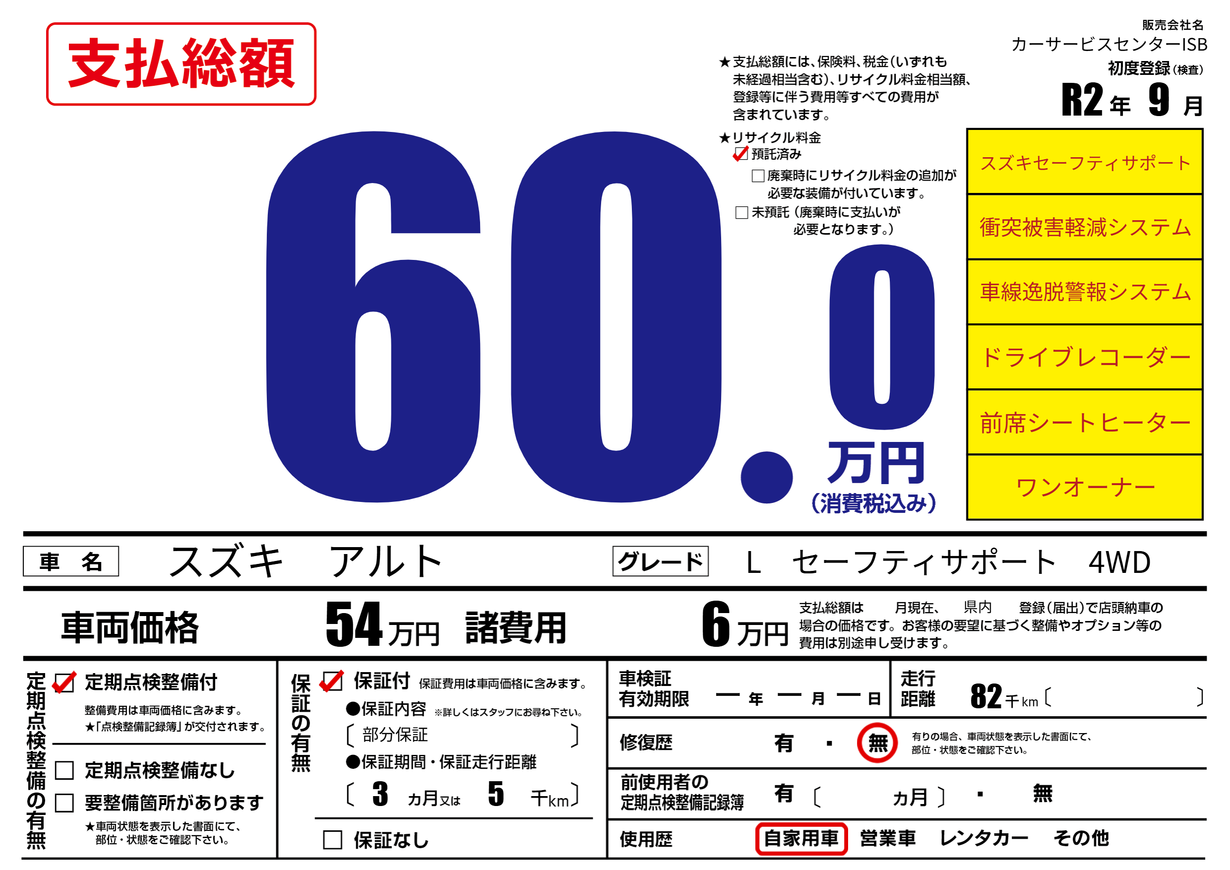 | 車名 | スズキ アルト | グレード ミッション 排気量 |