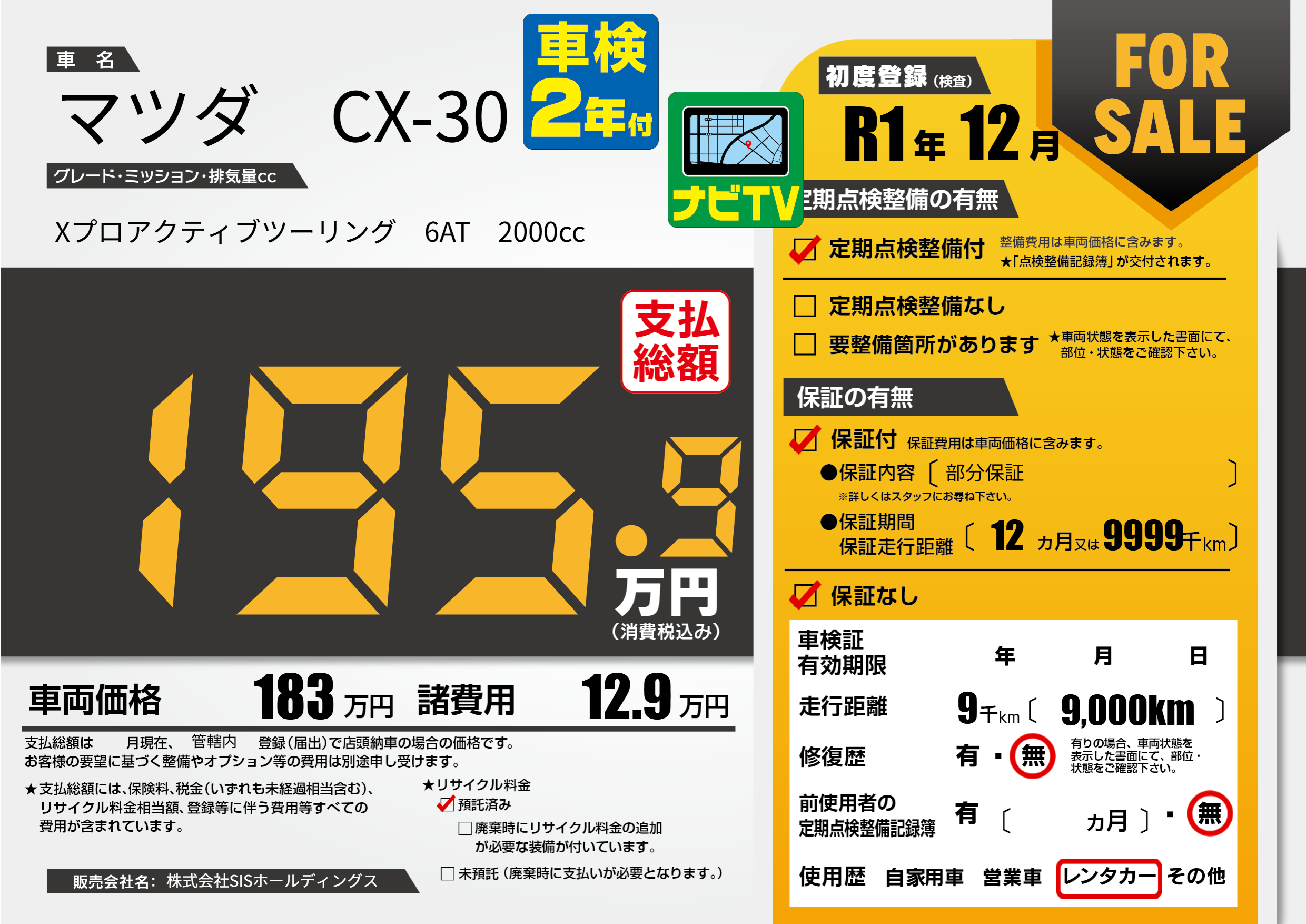 | 車名 | マツダ CX-30 | グレード ミッション 排気量 |