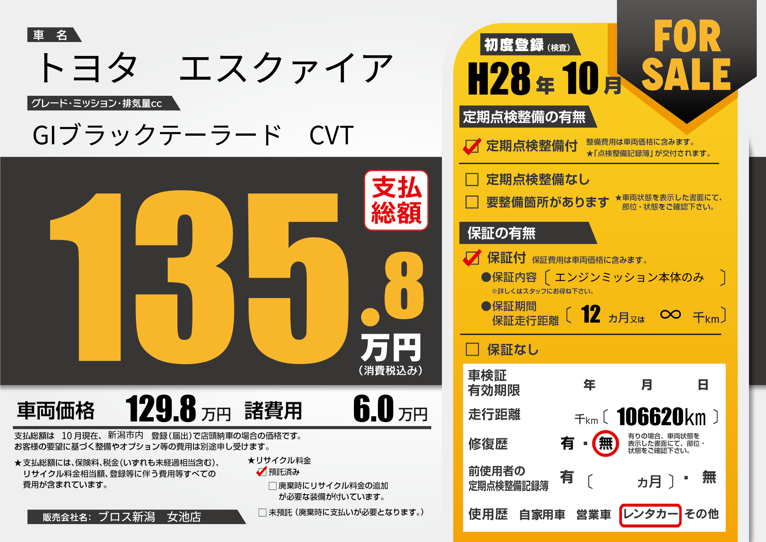 | 走行キロ | - | 初年度登録 | H28年10月 |