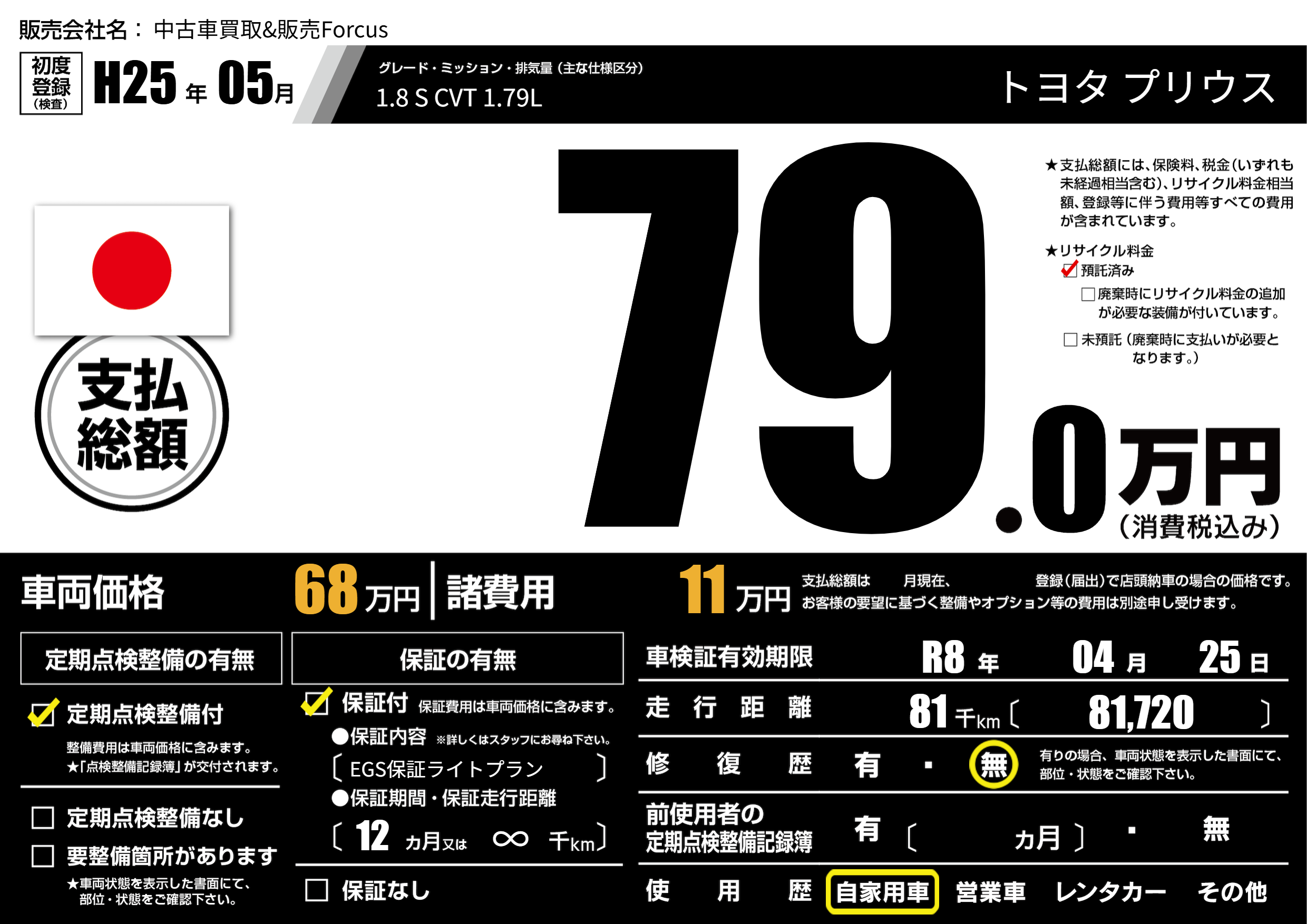 | 車名 | トヨタ プリウス | グレード ミッション 排気量 |