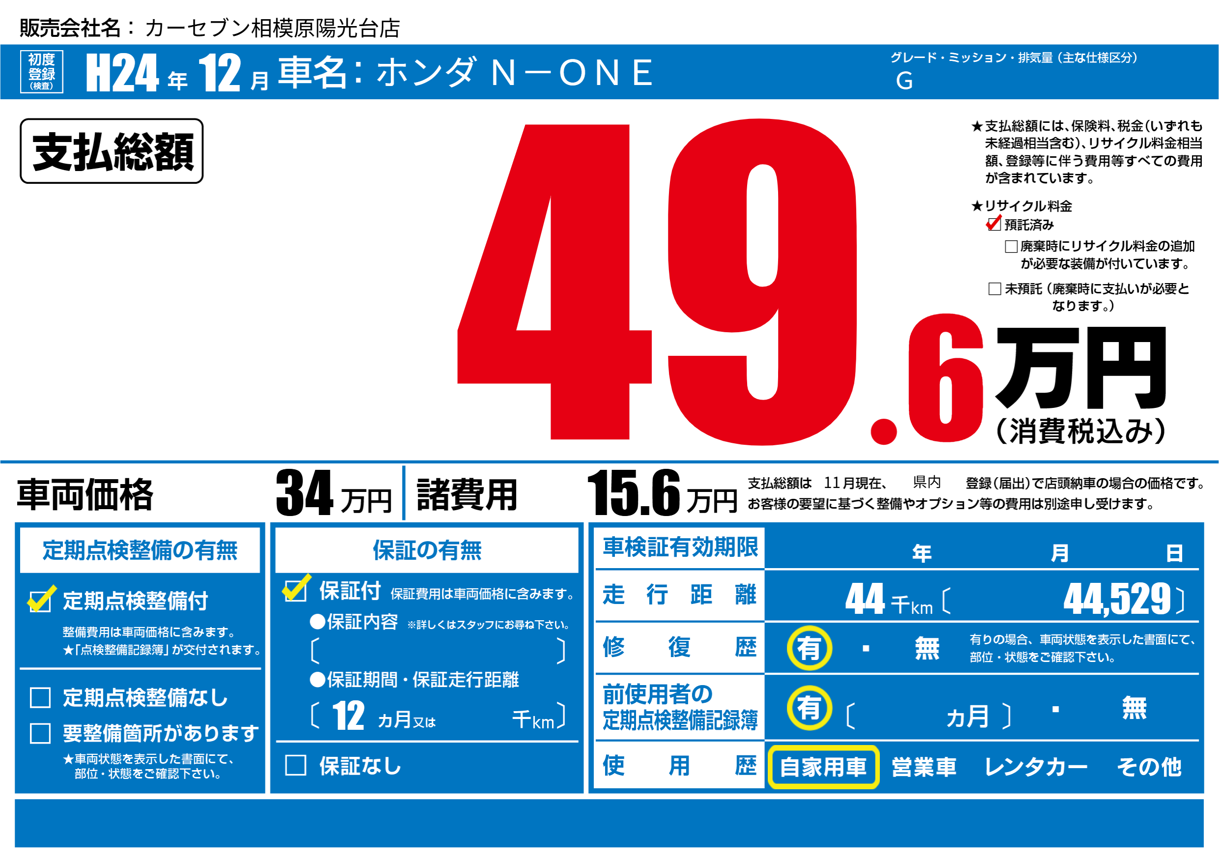 | 車名 | ホンダ N-ONE | グレード ミッション 排気量 |