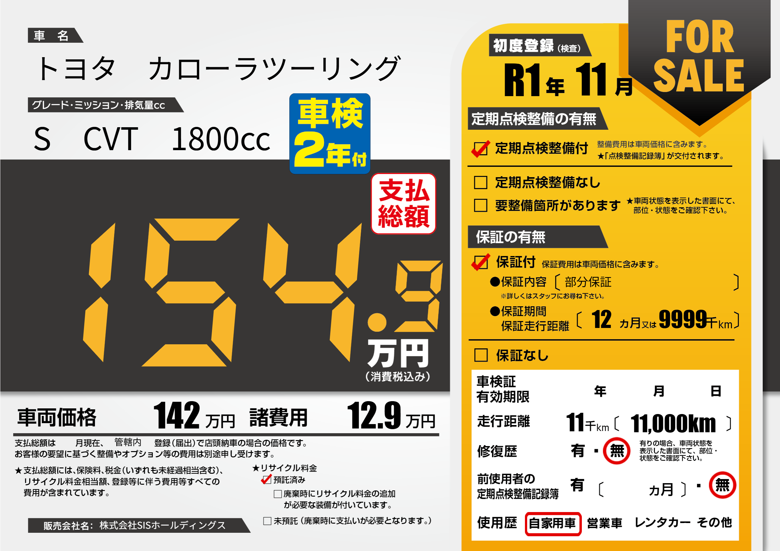 保証付き 保証内容(部分保証) 12ヶ月または(9999)千kmまで |