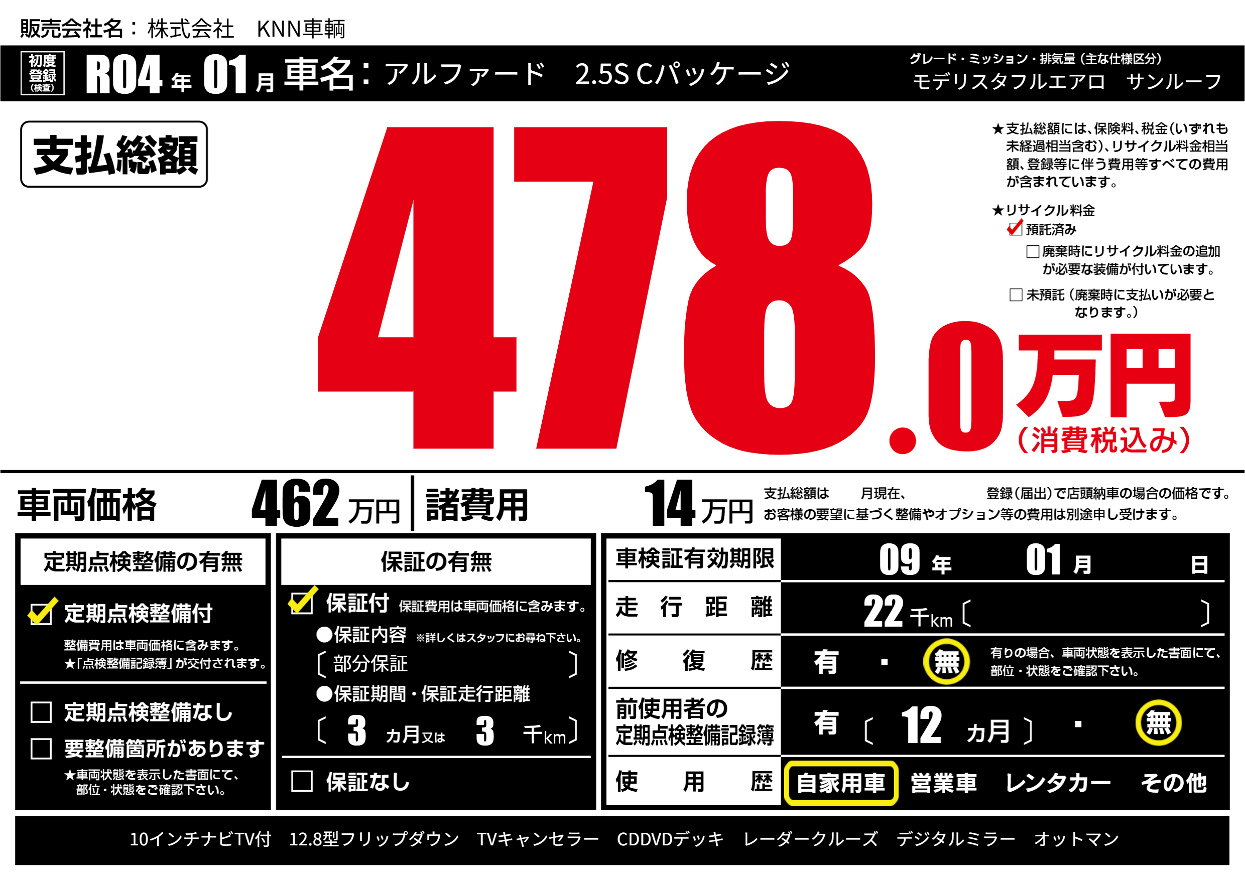 | 車名 | アルファード 2.5S Cパッケージ | グレード ミッション 排気量 |