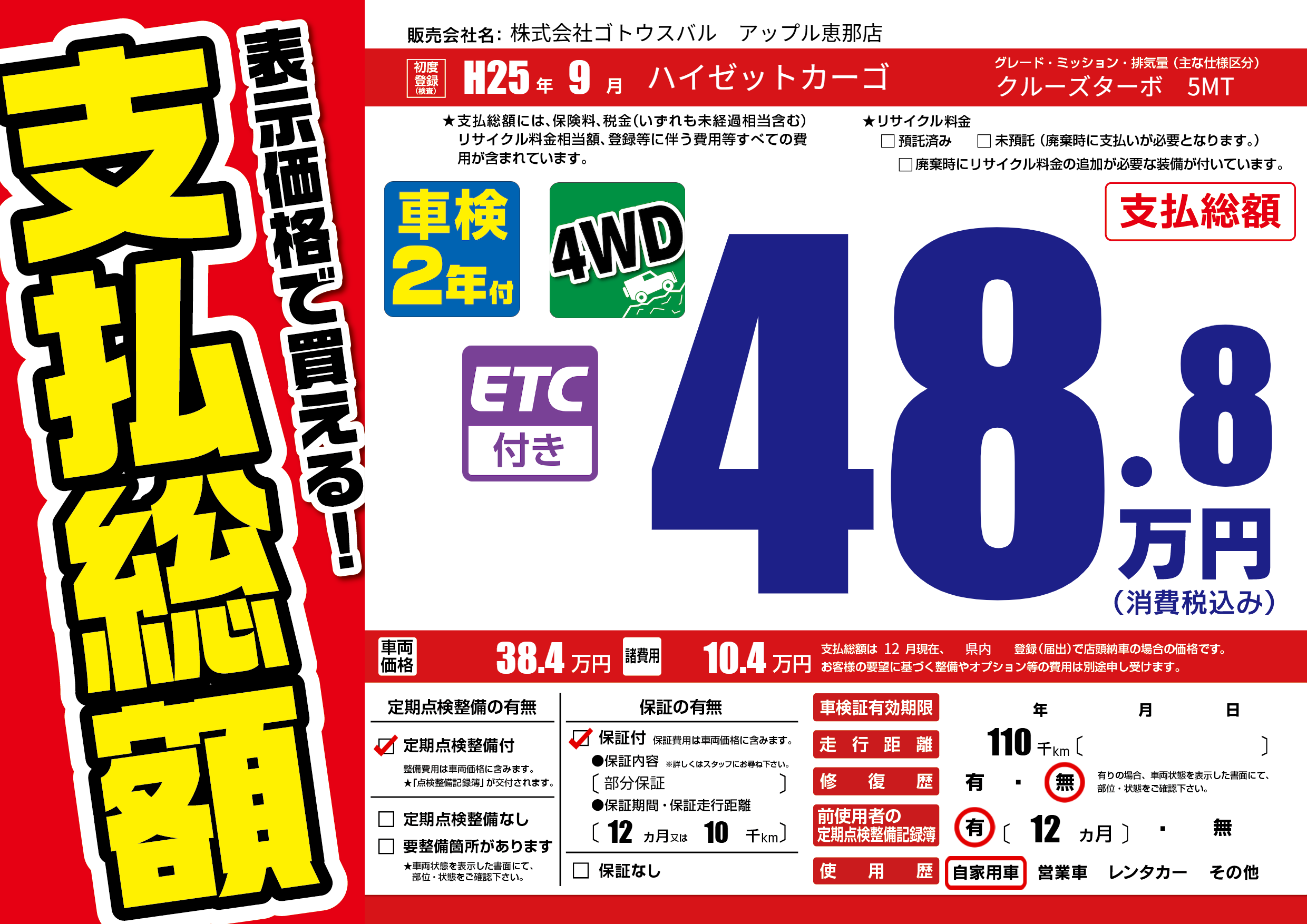 | 車名 | ハイゼットカーゴ | グレード ミッション 排気量 |