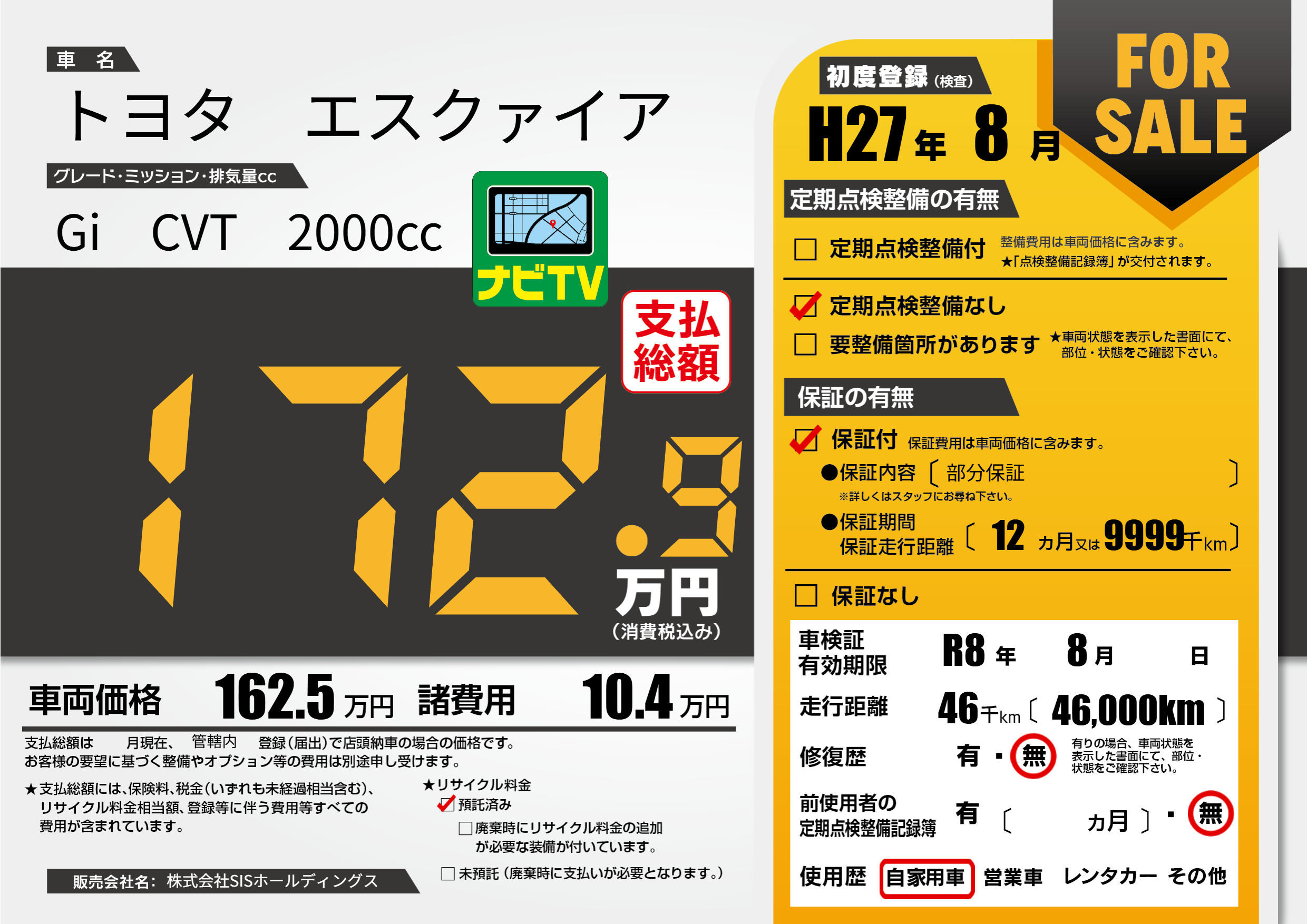 | 走行キロ | 4.6万km | 初年度登録 | H27年8月 |