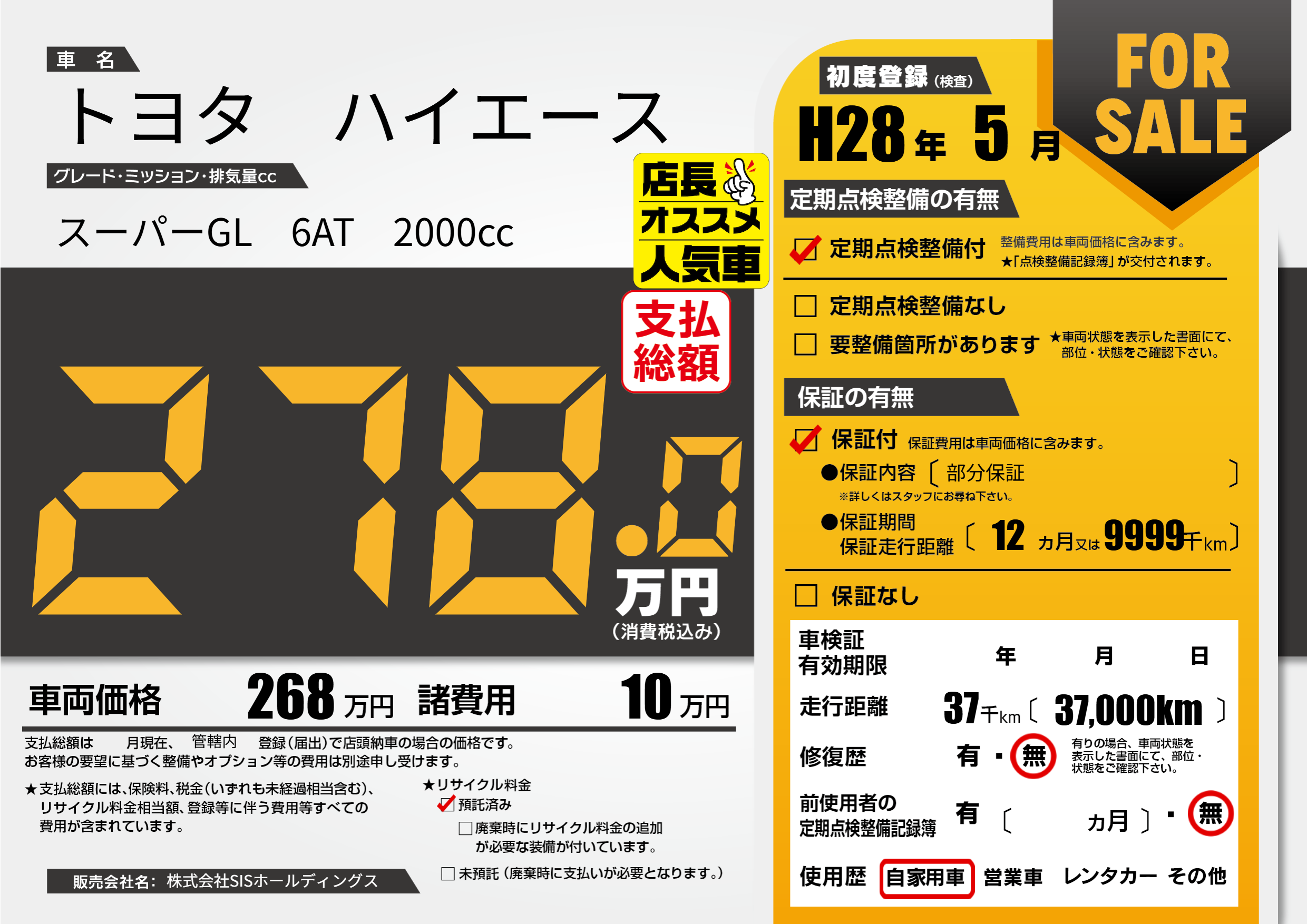 | 車名 | トヨタ ハイエース | グレード ミッション 排気量 |