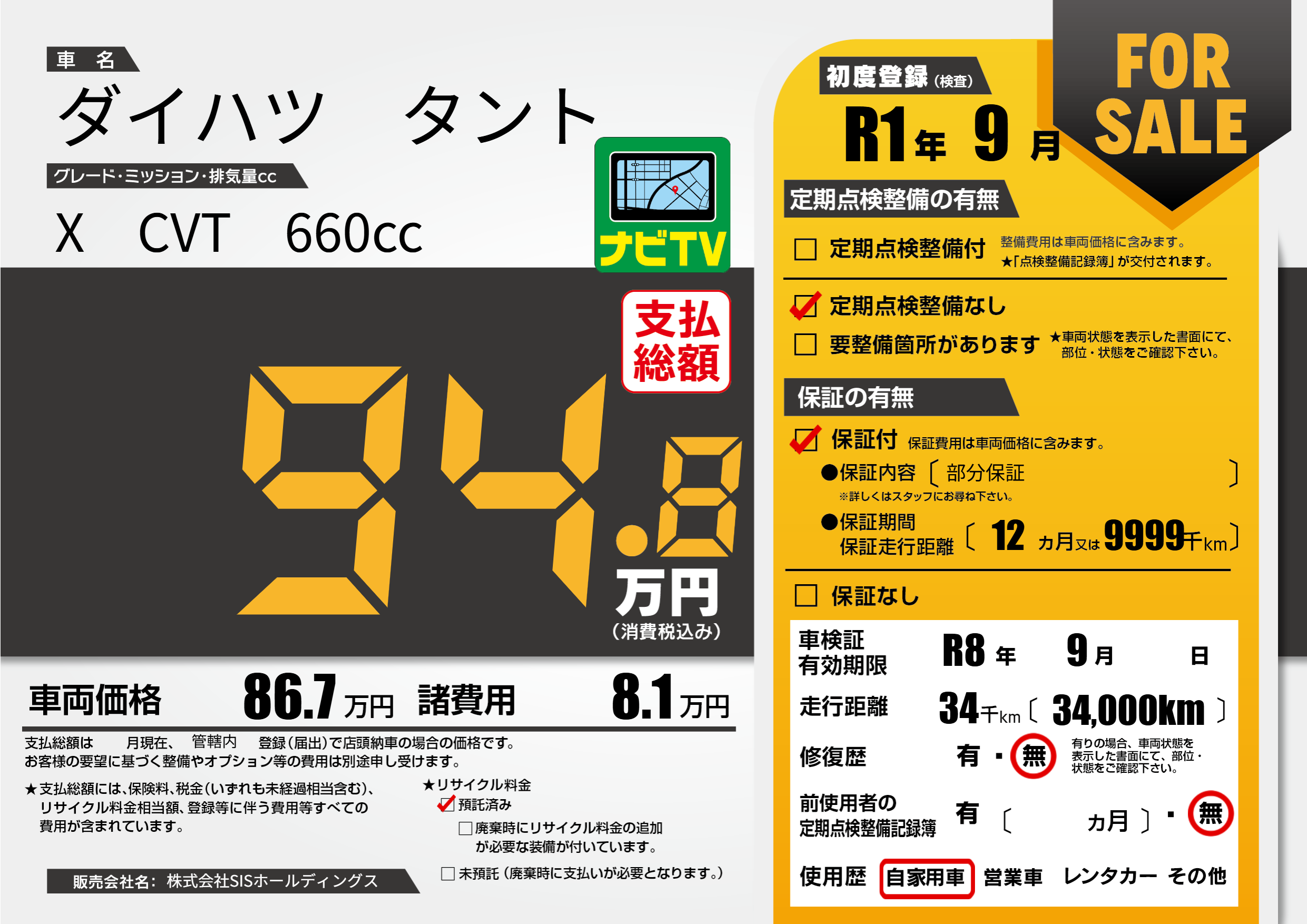 | 車名 | ダイハツ タント | グレード ミッション 排気量 |