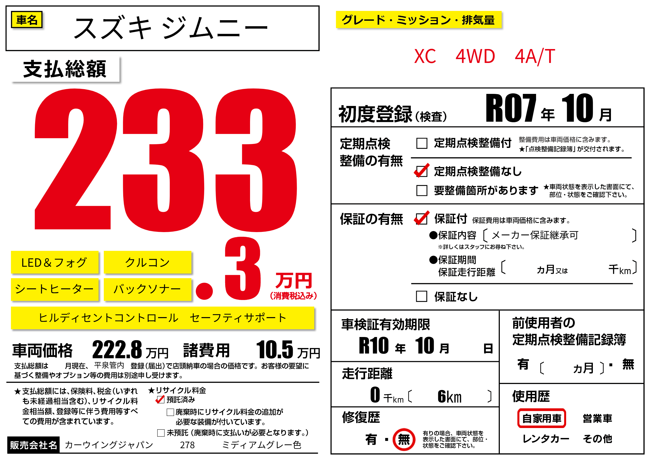 | 車検制限 | R10年 10月 - 日 | ||