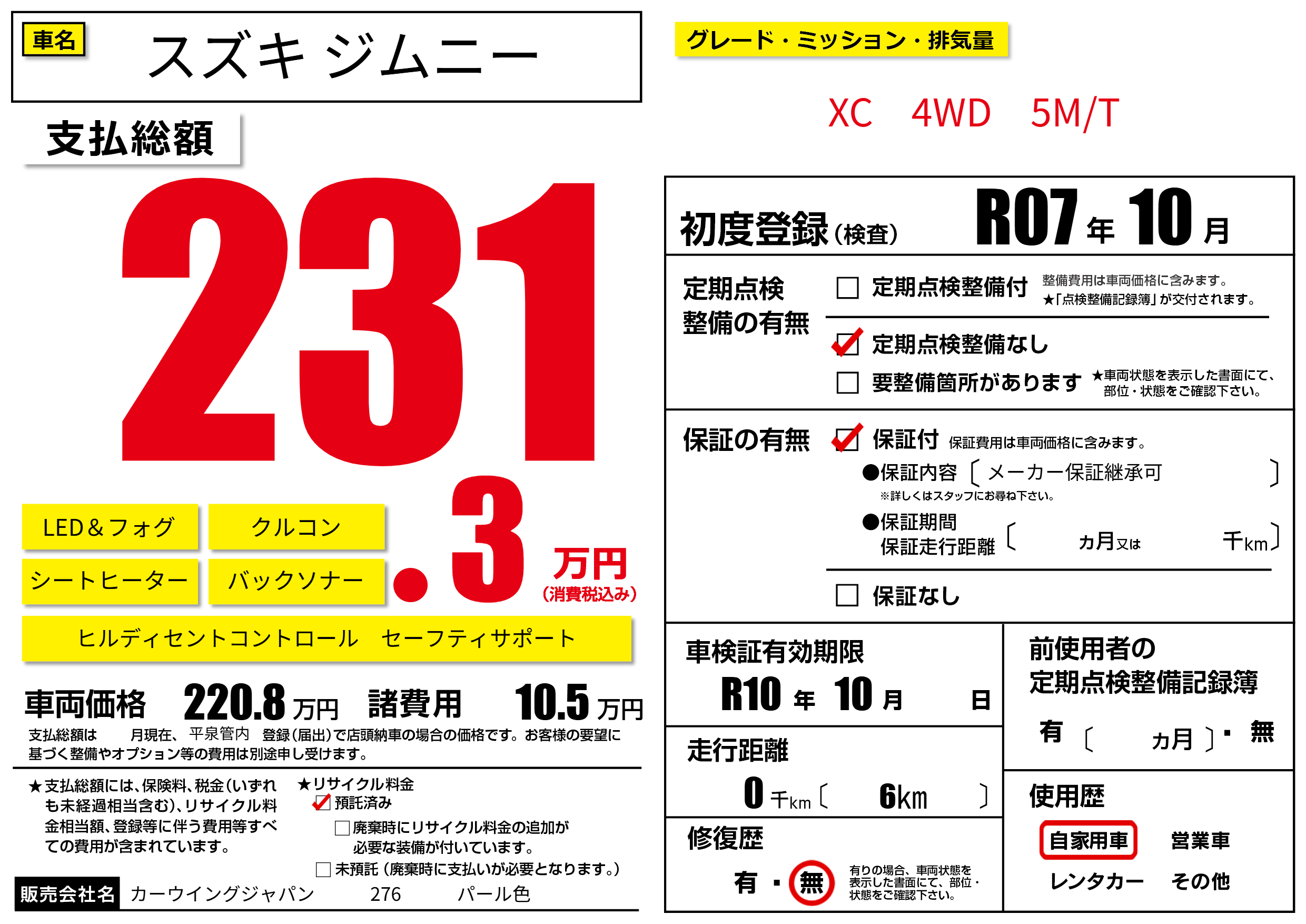 | 走行キロ | - | 初年度登録 | R07年10月 |