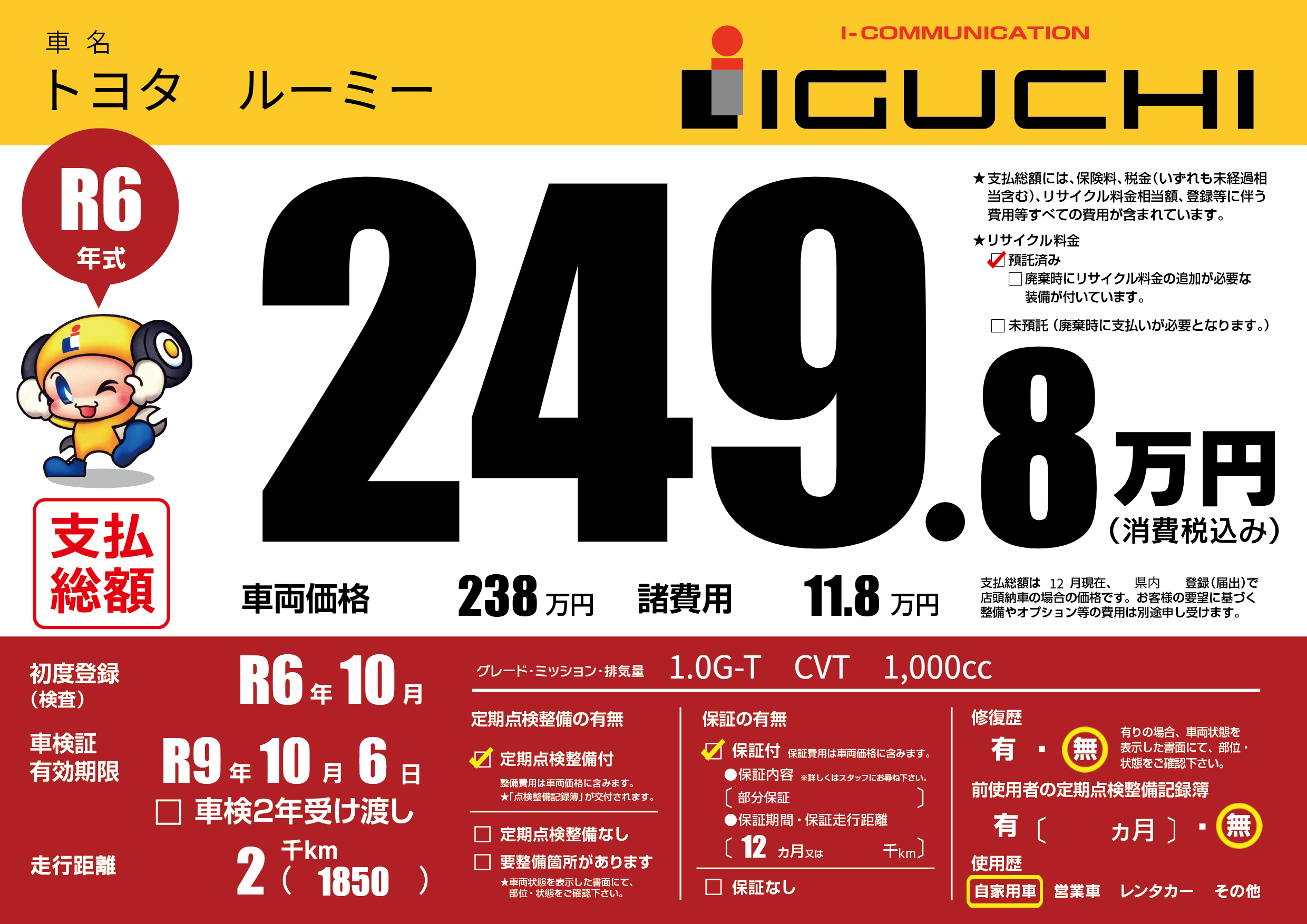 | 走行キロ | 0.2万km | 初年度登録 | R6年10月 |