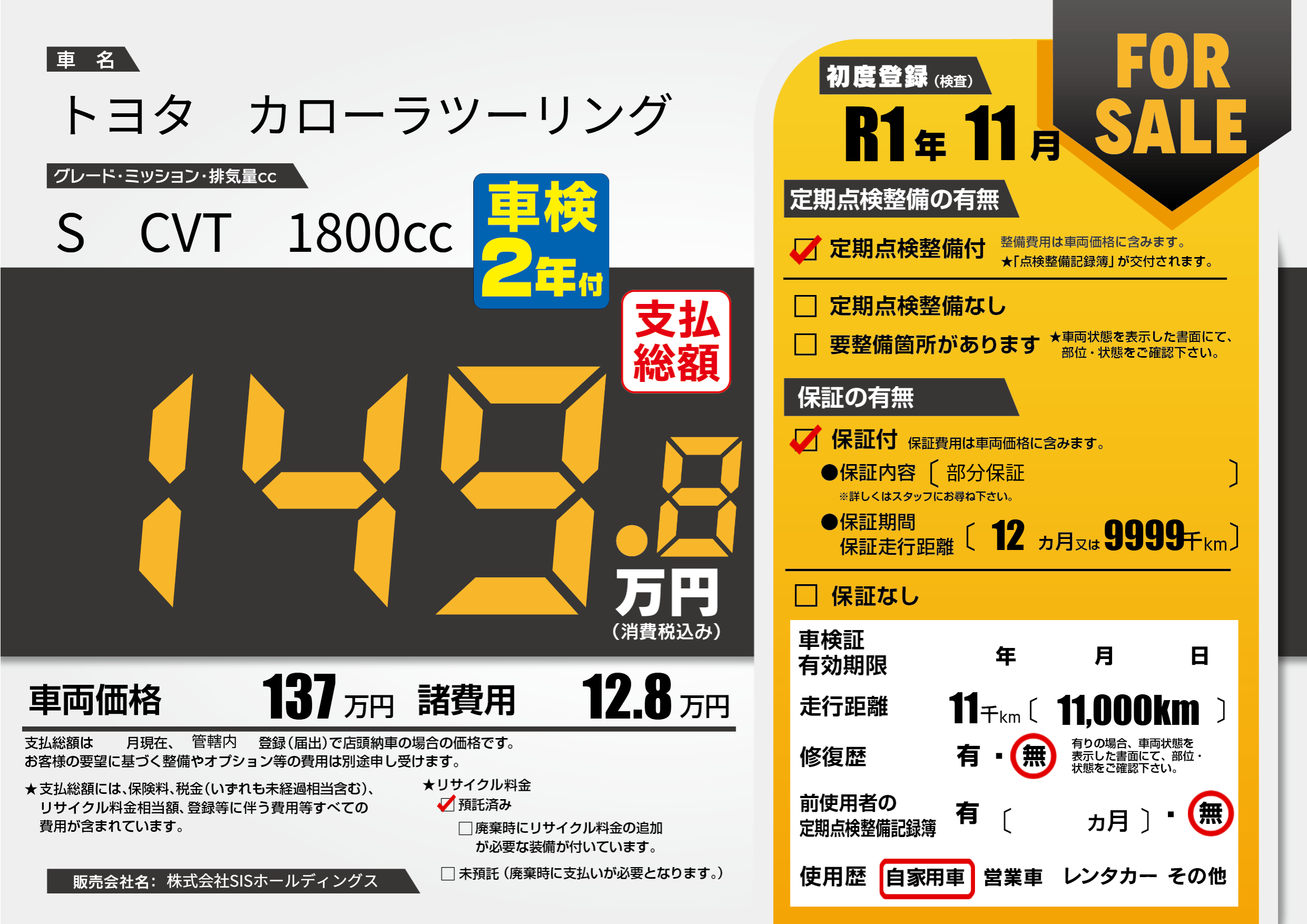 | 走行キロ | 1.1万km | 初年度登録 | R1年11月 |