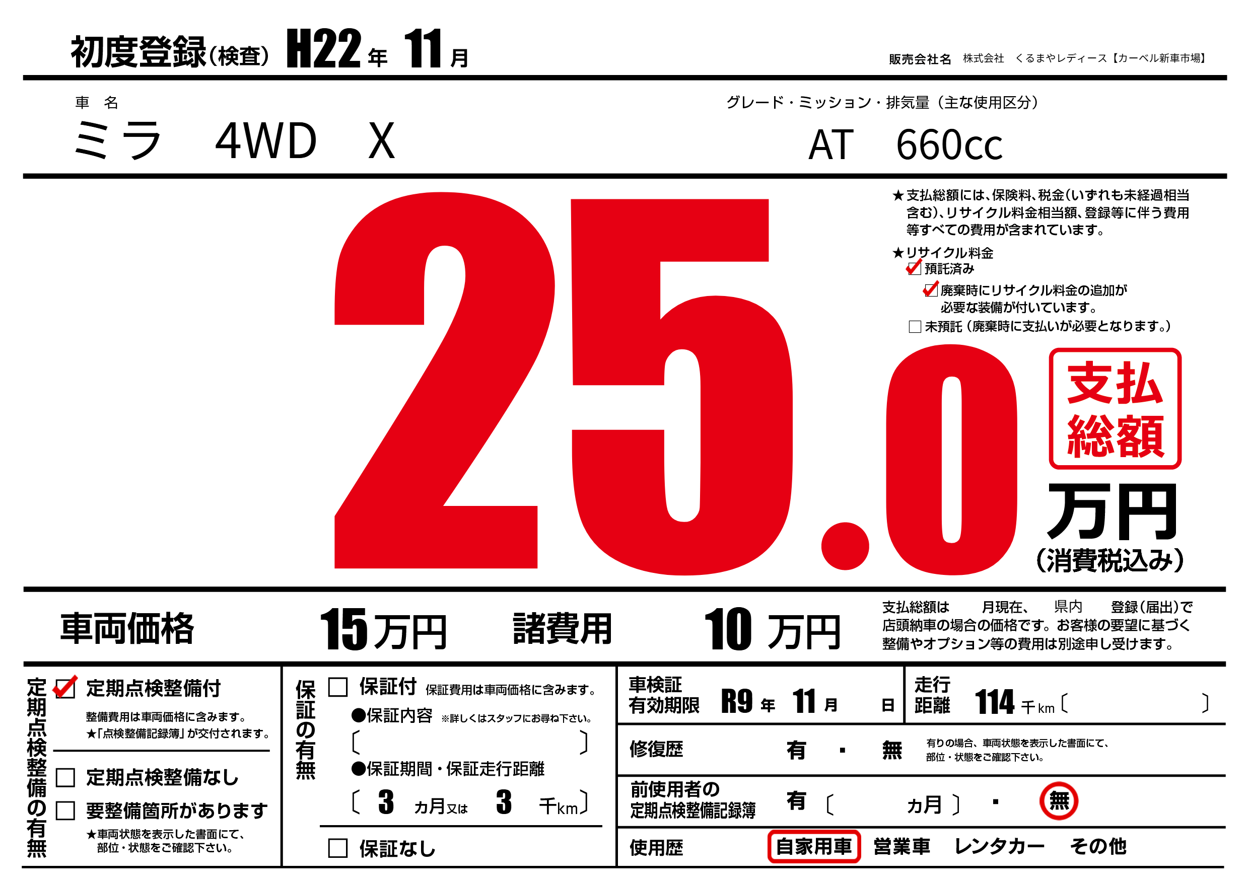 | 走行キロ | 11.4万km | 初年度登録 | H22年11月 |