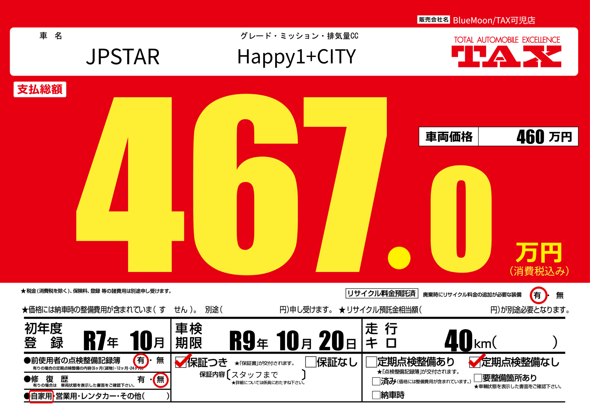 | 走行キロ | 4万km | 初年度登録 | R7年10月 |