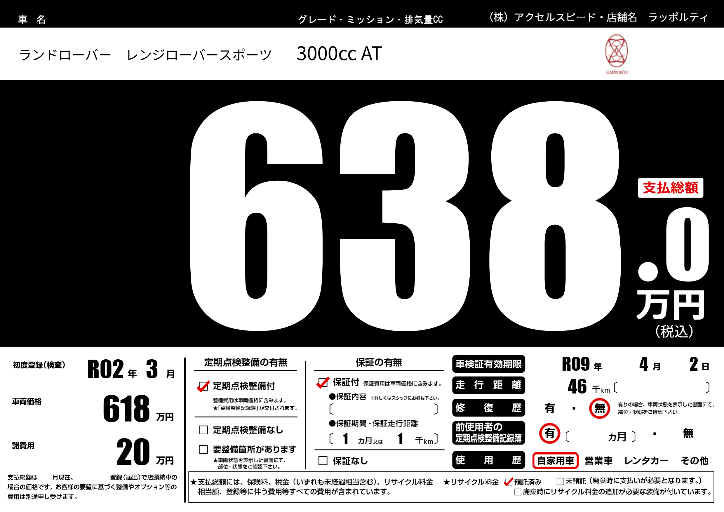 | 車名 | ランドローバー レンジローバースポーツ | グレード ミッション 排気量 |