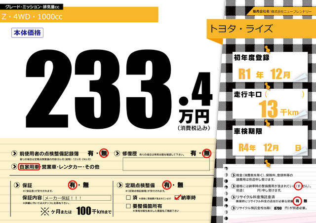 販売価格(支払い総額):- 年式: - 走行距離: 1万km