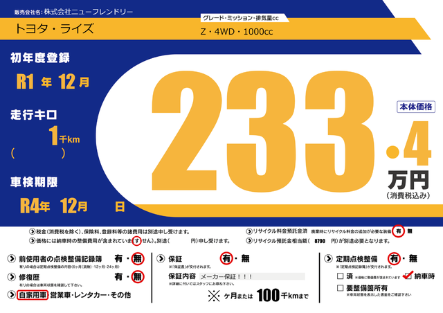 販売価格(支払い総額):- 年式: - 走行距離:1000km