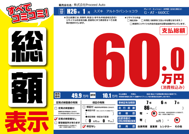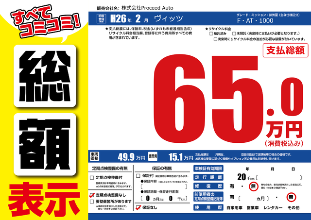 販売価格(支払い総額): 65万円 年式:2013年 走行距離: 9.1万km