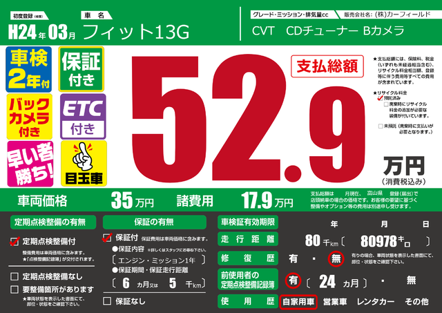 販売価格(支払い総額): 45万円 年式:2012年 走行距離: 8.8万km