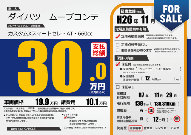 販売価格(支払い総額): 29.8万円 年式:2011年 走行距離: 1.6万km