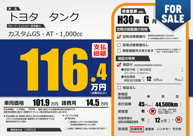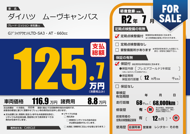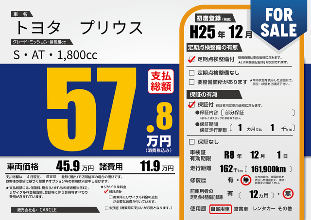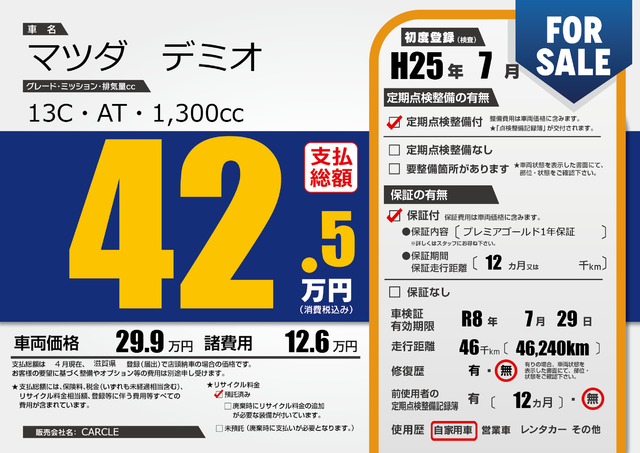 販売価格(支払い総額): 65万円 年式:2012年 走行距離: 1.7万km