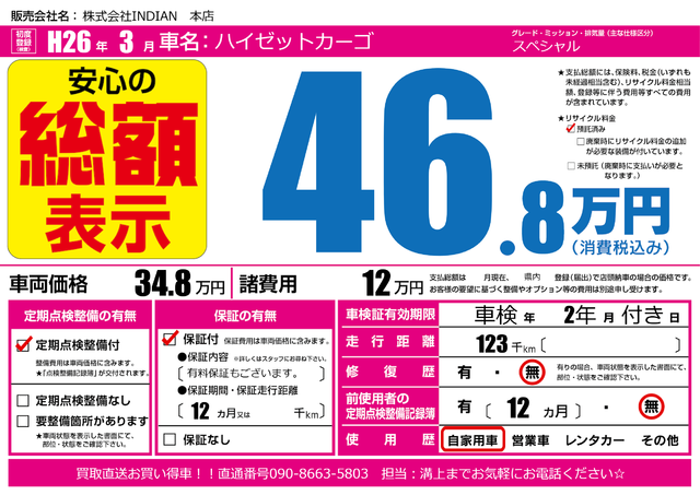 販売価格(支払い総額): 46.8万円 年式:2015年 走行距離: 14万km