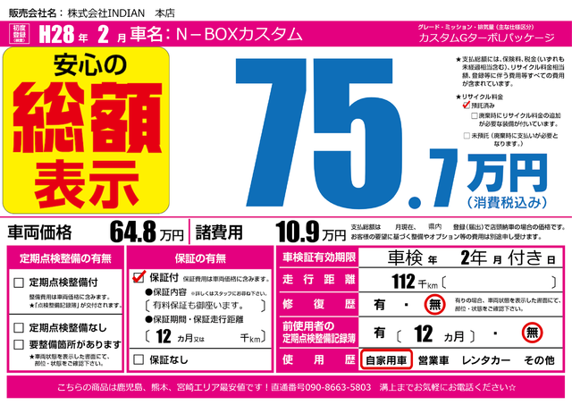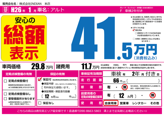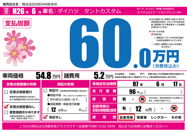 販売価格(支払い総額): 61.5万円 年式:2014年 走行距離: 5万km