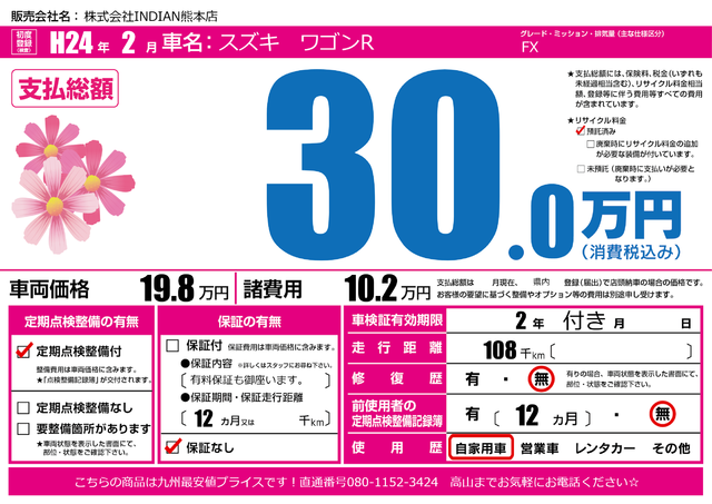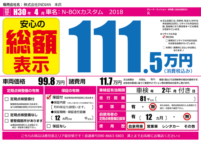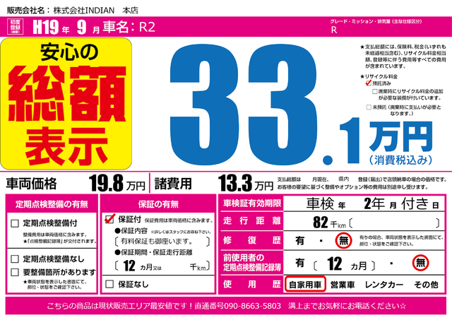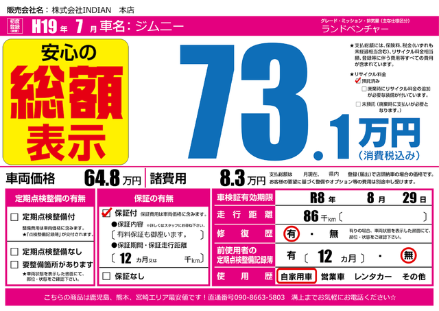 販売価格(支払い総額): 80万円 年式:2007年 走行距離: 1.1万km