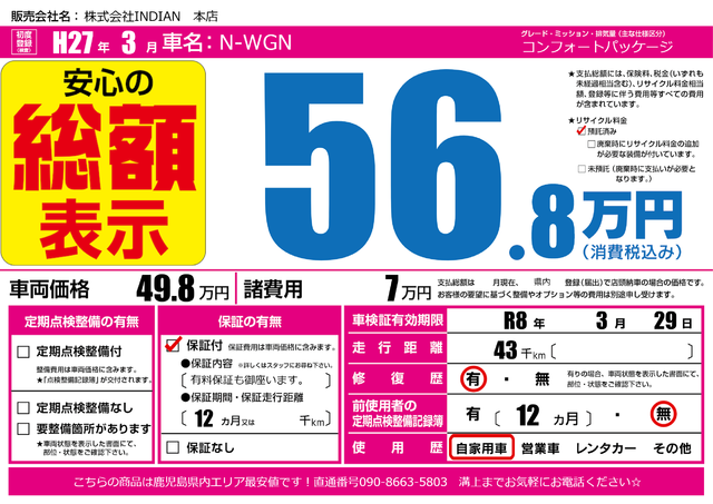 販売価格(支払い総額): 34.8万円 年式:2014年 走行距離: 8.5万km