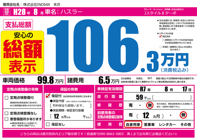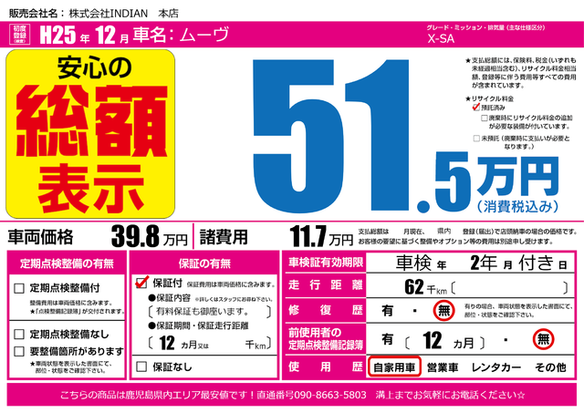 販売価格(支払い総額): 46.8万円 年式:2014年 走行距離: 10万km