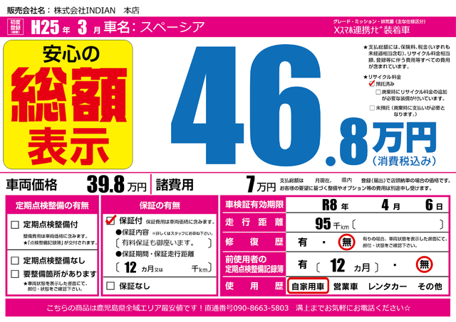 販売価格(支払い総額): 51.8万円 年式:2014年 走行距離: 11万km