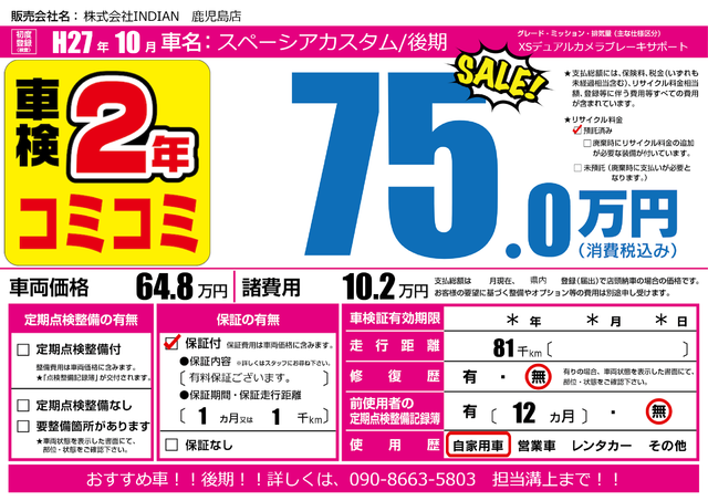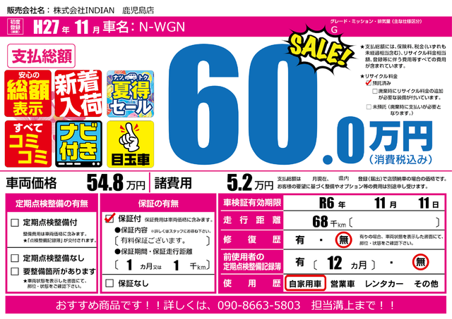 販売価格(支払い総額): 57.6万円 年式:2015年 走行距離: 6.8万km