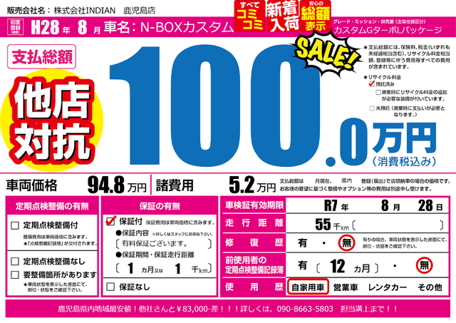 販売価格(支払い総額): 42.6万円 年式:2016年 走行距離: 9.9万km