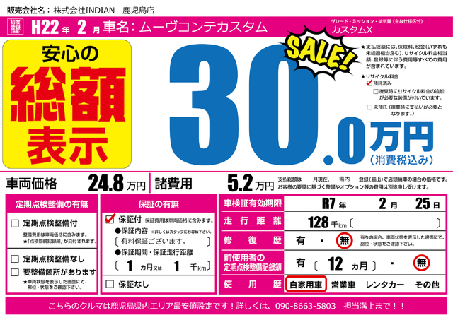 販売価格(支払い総額): 29万円 年式:2009年 走行距離: 7.3万km