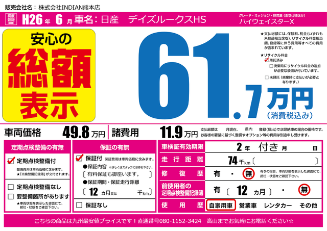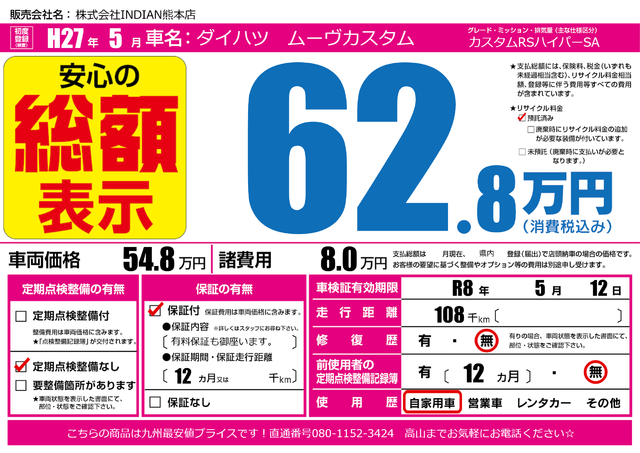 販売価格(支払い総額): 52.8万円 年式:2014年 走行距離: 1.5万km