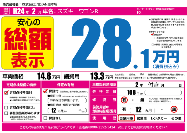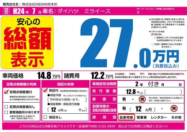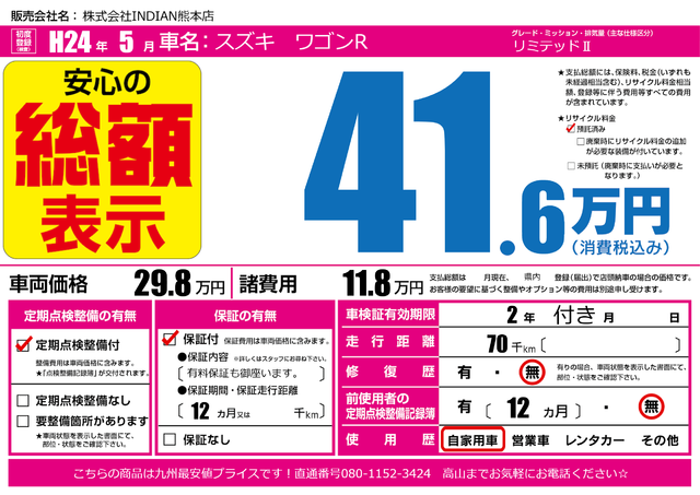 販売価格(支払い総額): 28万円 年式:2011年 走行距離: 12.4万km