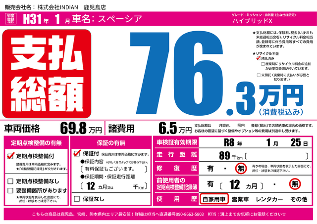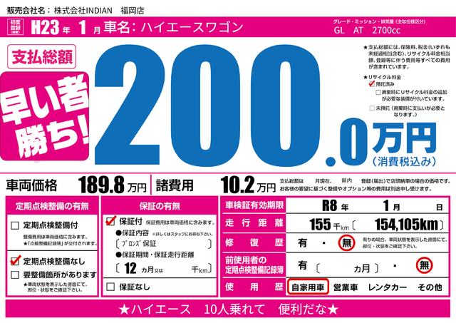 販売価格(支払い総額): 83万円 年式:2011年 走行距離: 9.4万km
