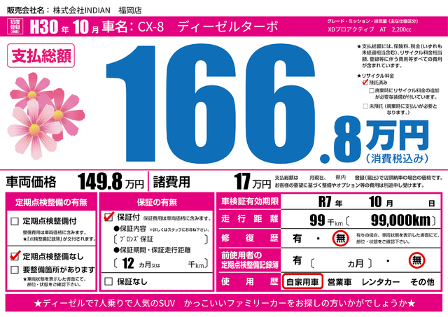 販売価格(支払い総額): 139万円 年式:2014年 走行距離: 10.2万km