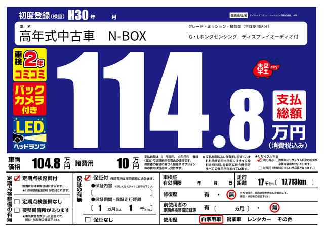 販売価格(支払い総額):109.8万円 年式:2018年 走行距離: 1.9万km
