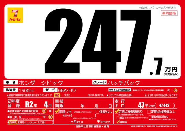 販売価格(支払い総額): 47.7万円 年式:2012年 走行距離: 7.3万km