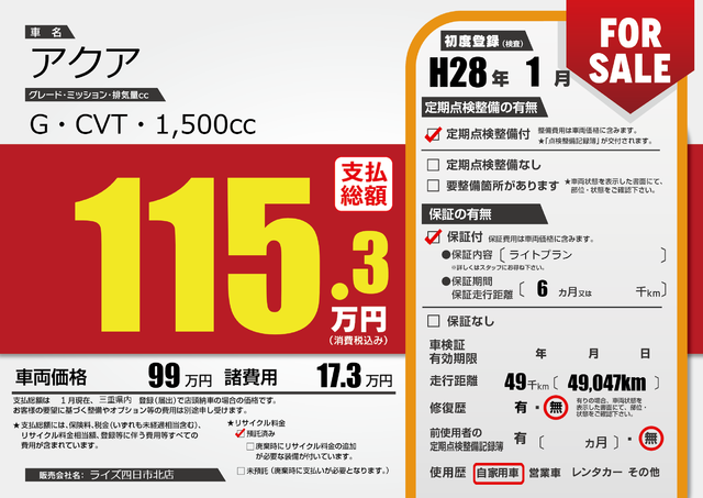 販売価格(支払い総額): 47万円 年式:2007年 走行距離: 7万km