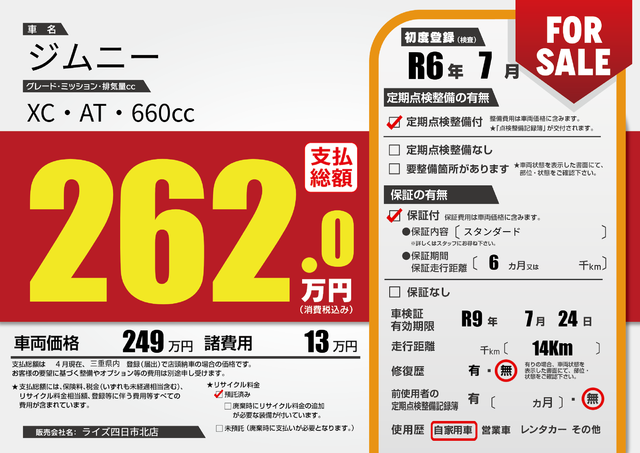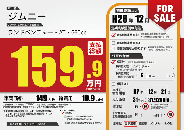 販売価格(支払い総額):109.9万円 年式: - 走行距離: 6.5万km