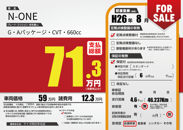 販売価格(支払い総額): 59.9万円 年式:2014年 走行距離: 2.9万km