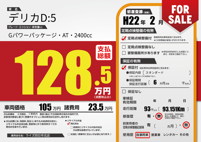 販売価格(支払い総額): 130万円 年式: - 走行距離: 2.5万km