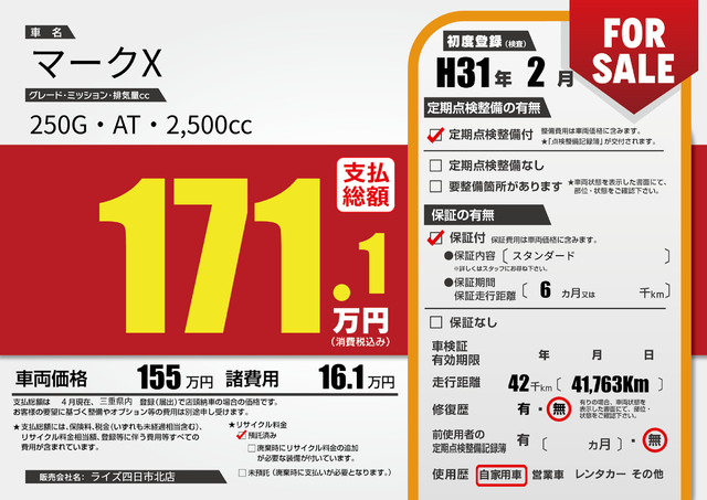 販売価格(支払い総額): 150万円 年式: - 走行距離: 2.5万km