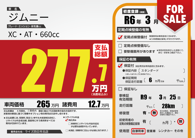 販売価格(支払い総額):275.4万円 年式: - 走行距離:4000km