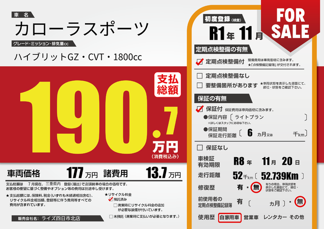 販売価格(支払い総額): 425万円 年式: - 走行距離: 1.3万km