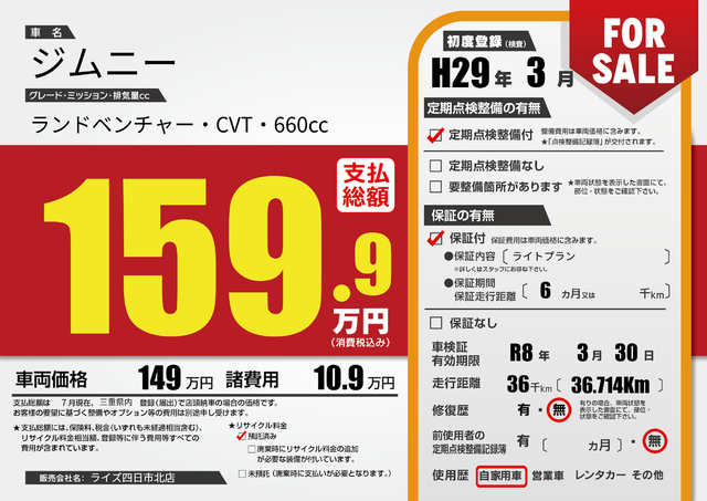 販売価格(支払い総額): 150万円 年式:2014年 走行距離: 6.1万km