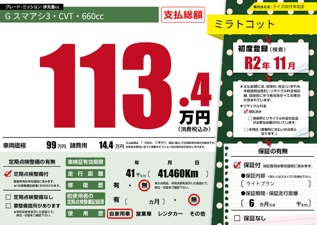 販売価格(支払い総額): 79.5万円 年式:2014年 走行距離: 5.1万km