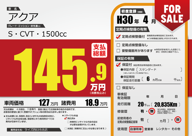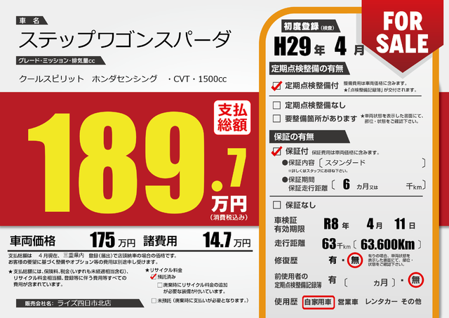 販売価格(支払い総額): 84万円 年式:2013年 走行距離: 6.4万km