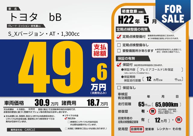 販売価格(支払い総額): 28.5万円 年式:2014年 走行距離: 1.1万km